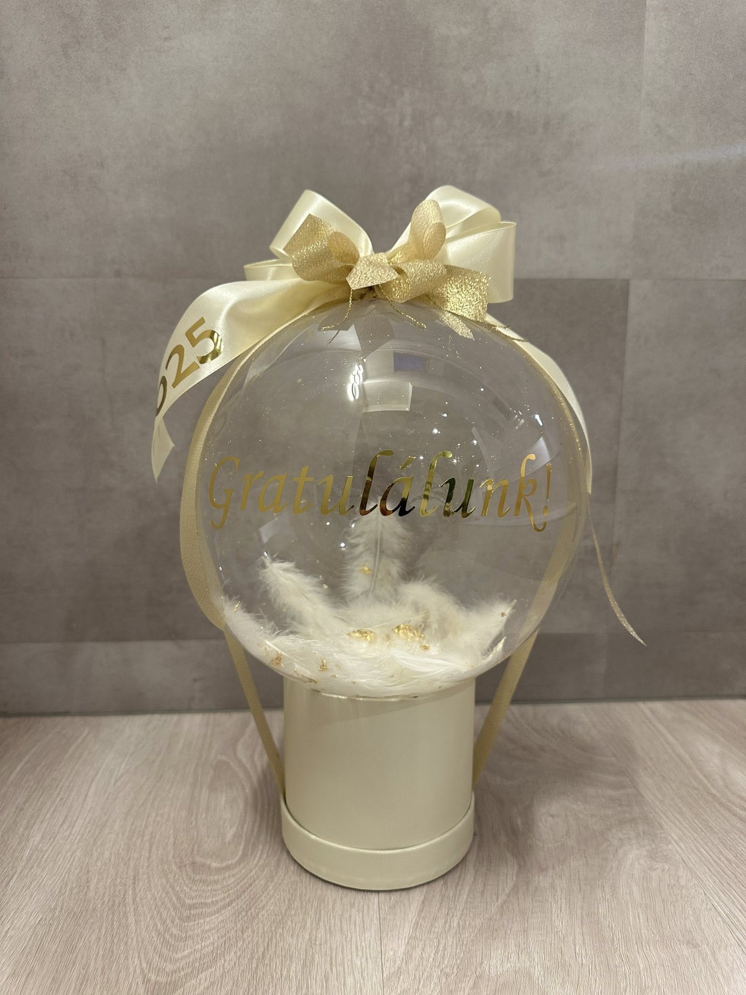 Örök lufi box arany „Gratulálunk” felirattal, 50 cm-es méretben. Tartalma tollak és dekoratív arany masni, tökéletes ajándék bármilyen ünnepi alkalomra.